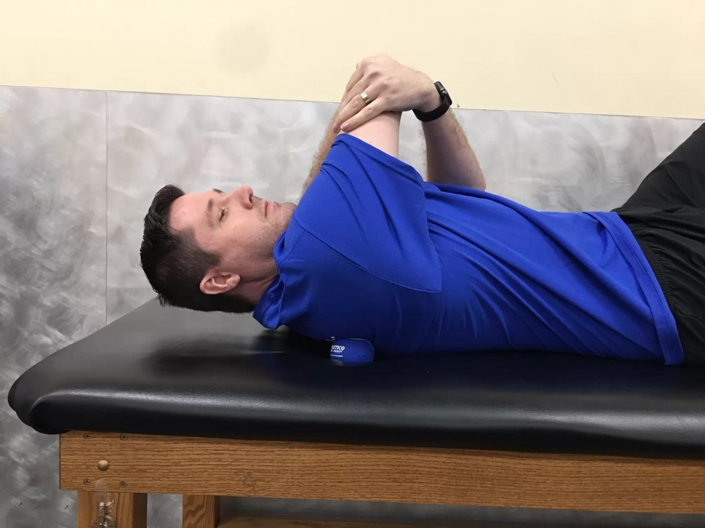 - With a pillow under your elbow, hold a weight and rotate your arm outward.